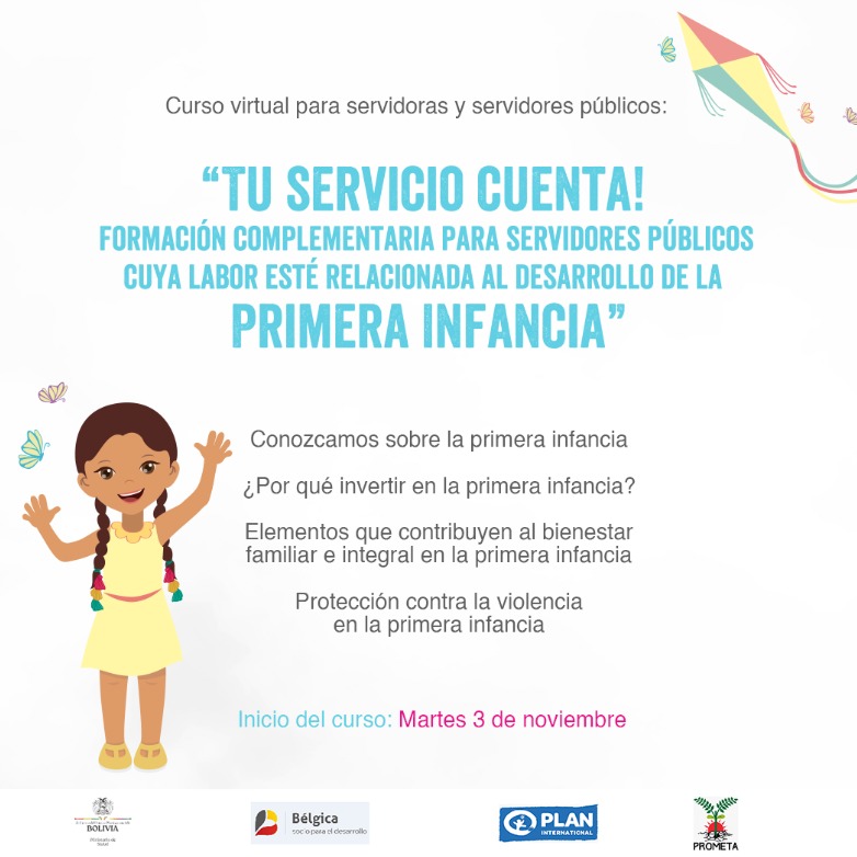PROMETA, en asocio con Plan International Inc. Bolivia, con el apoyo de la Cooperación Belga para el Desarrollo, lanza el Curso Virtual: “Tu servicio cuenta! Formación complementaria para servidores públicos cuya labor esté relacionada al desarrollo de la Primera Infancia” con el objetivo de desarrollar capacidades y habilidades que coadyuven, tanto en la labor de servicio profesional, así como en la construcción de acciones que promuevan el Desarrollo Integral de la Primera Infancia.