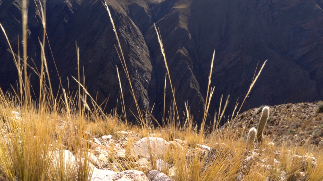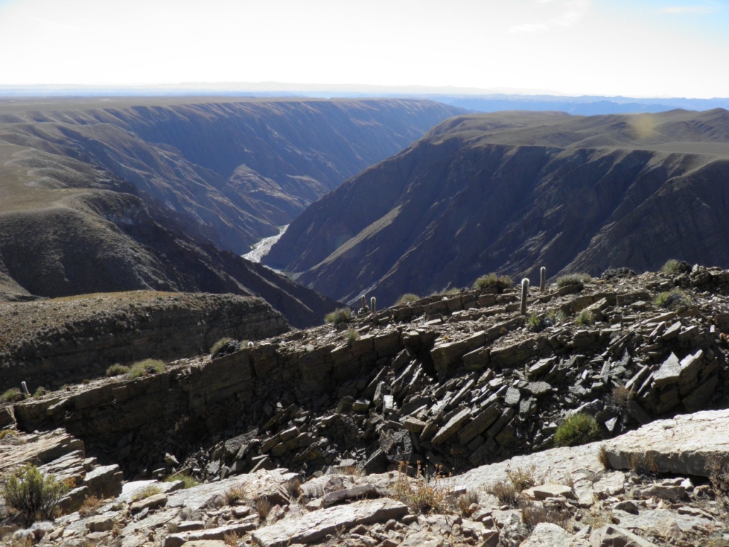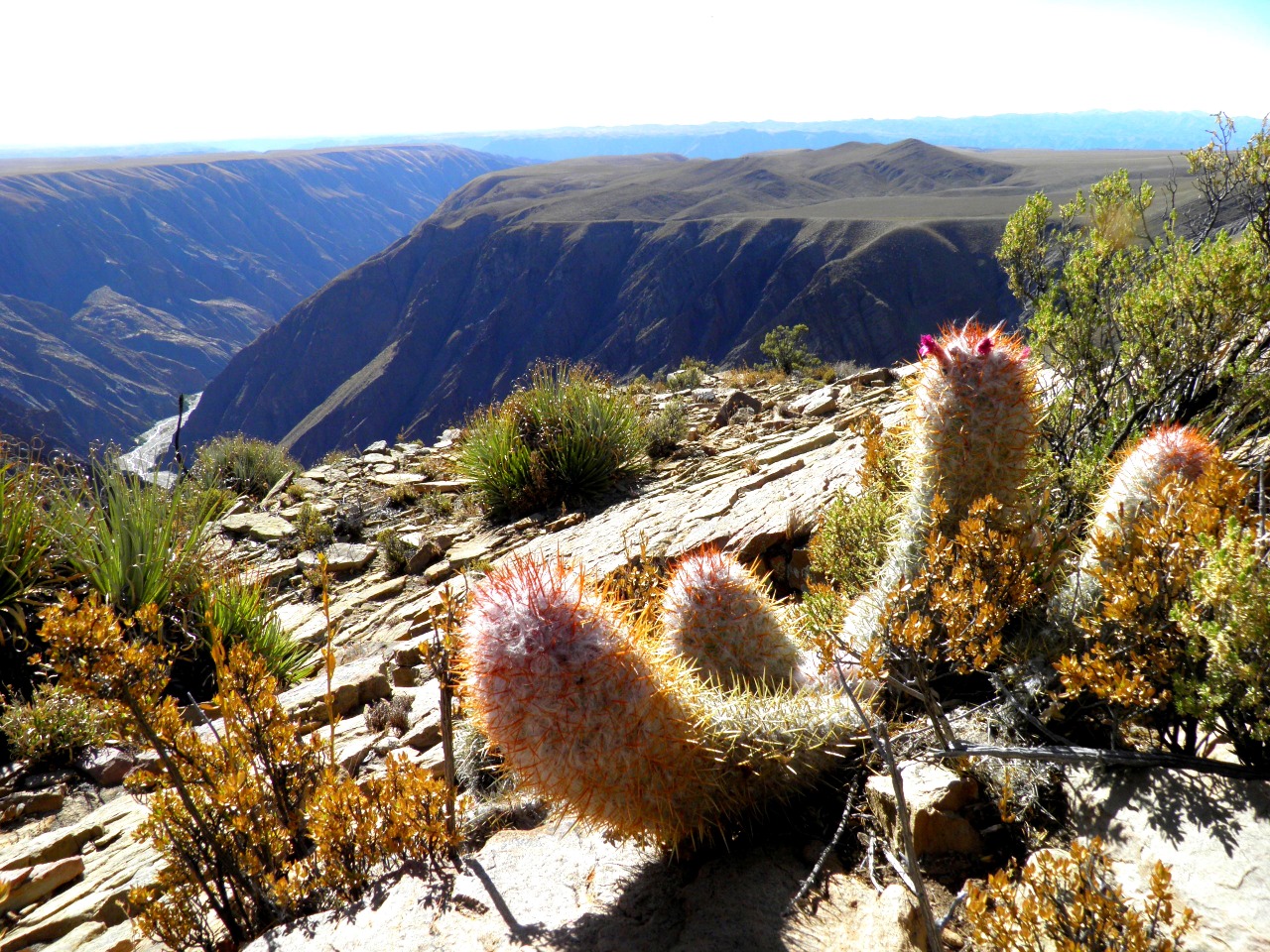 Tímido entre las rocas y el cascajo un cactus se abre paso desafiando la rudeza del paisaje con sus pequeñas flores rosas. A escasos metros, las enormes montañas brindan sus faldas para formar una vasta cuna de aproximadamente 900 metros de profundidad.